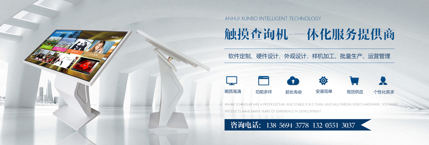 迅博智能 位于中國科教城---合肥市,和經濟開發(fā)區與高新區毗鄰,地址合肥市肥西縣湯口路與皋城路交口人民萬福產業園一期12棟東側,是一家IT領域的高新技術企業,全心全意服務于信息化建設,做專業的信息化提供商,全力打造信息時代新模式。 迅博智能 主要從事觸摸屏、觸摸顯示器、OLED柔性觸摸屏、觸摸查詢一體機系列產品及觸摸顯示互動體驗軟硬件產品;智能排隊叫號、網上預約排隊叫號、安康碼皖事通取號系統;曲面屏、OLED 屏幕、柔性屏、LCD液晶大屏拼接系統;落地式、壁掛式單機版網絡版室內外廣告機及數字標牌廣告信息發(fā)布系統;室內外LED電子格柵透明屏、單雙色、全彩電子大屏;各類辦事營業廳:公積金...